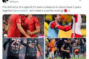 体育资讯4月5日讯 穆勒今日宣布世俱杯后将离队,结束25年拜仁生涯,对于穆勒,凯恩也送上了祝福。